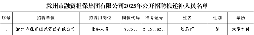根據(jù)《滁州市融資擔(dān)保集團(tuán)有限公司2025年公開(kāi)招聘工作人員公告》相關(guān)規(guī)定,經(jīng)報(bào)名、資格審查、筆試、面試、體檢、考察等招聘程序,現(xiàn)將擬遞補(bǔ)人員予以公示。