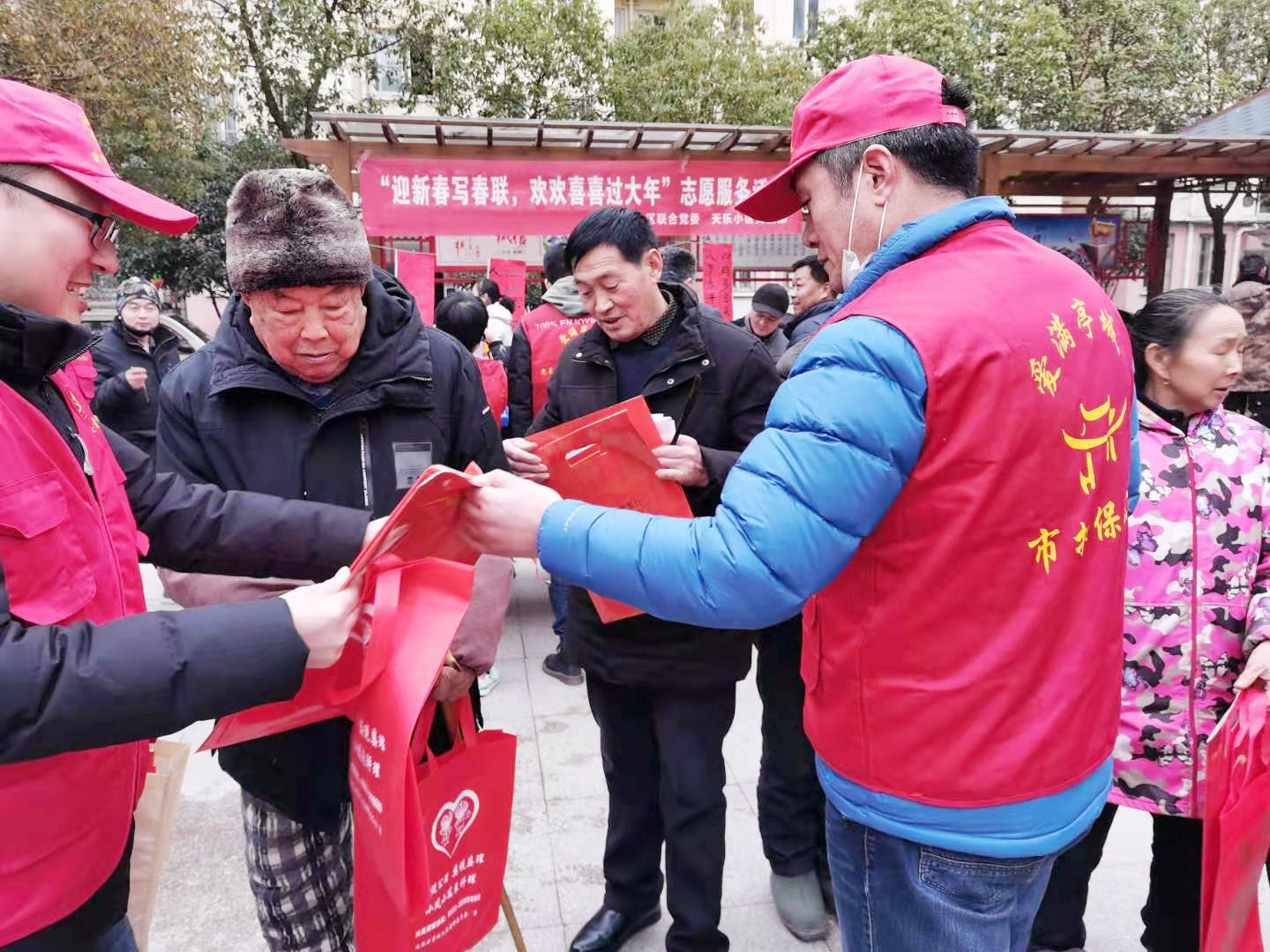 志愿者向居民發(fā)放春聯(lián)和防疫物品等